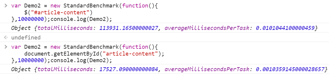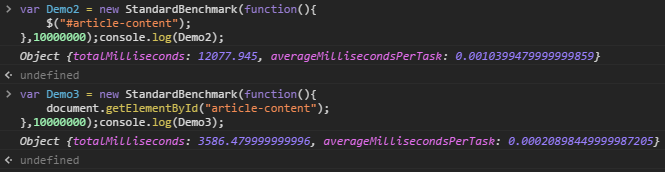 To test the StandardBenchmark function, we are going to execute a simple DOM Query using jQuery and VanillaJS. The task will be executed 10000000 (10M) times, see the following image :