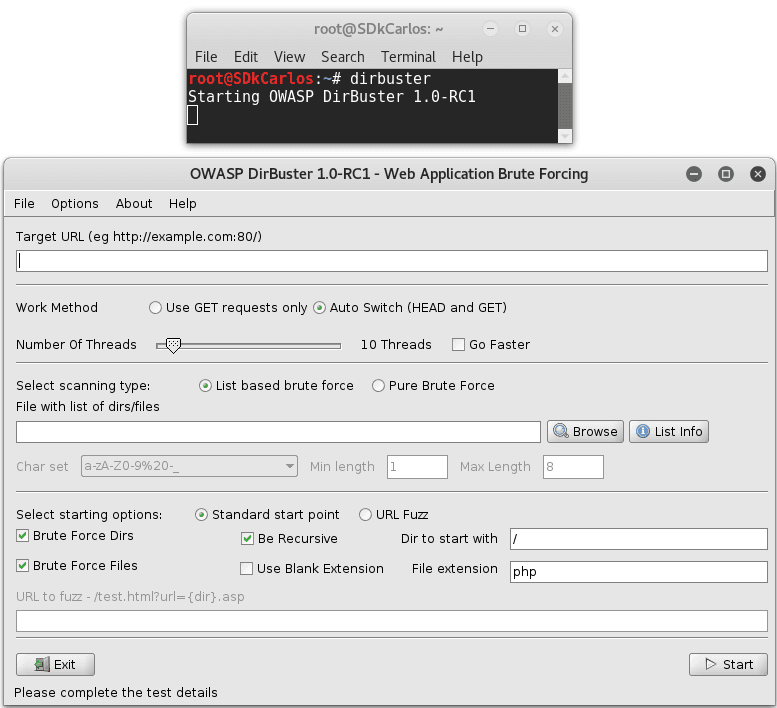 To start the scan on the website, just press the Start button in the GUI. In this step DirBuster will attempt to find hidden pages/directories and directories within the providen url, thus giving a another attack vector (For example. Finding an unlinked to administration page).