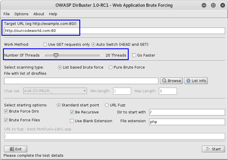 The number of threads that will be used to execute the brute forcing depends totally on the hardware of your computer. In this example we are going to use only 20 threads as our computer ain't so powerful and we want to do other things during the scan of DirBuster: