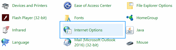 Once in the panel, expand the icons and search for the Internet Options button and click on it: